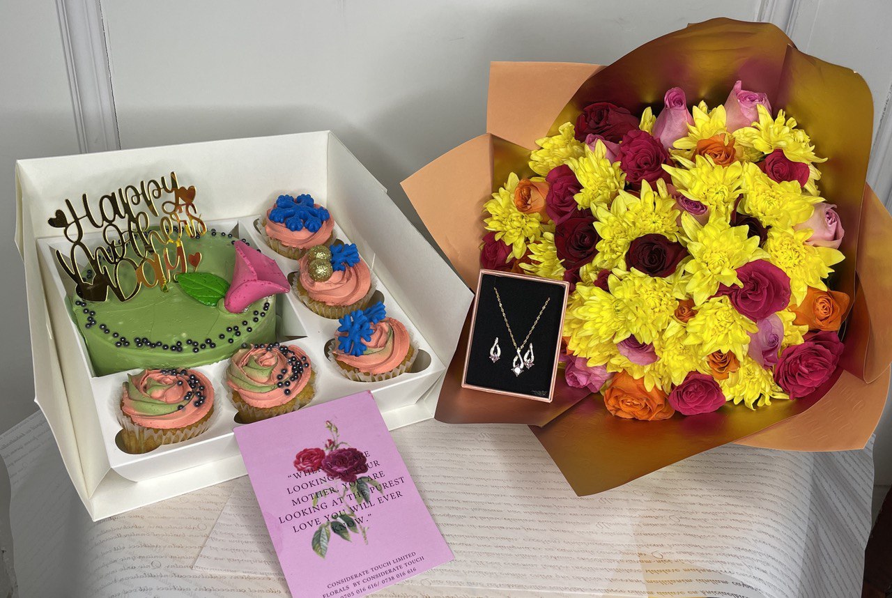 Sweet Tooth Mother’s Touch. Flowers (Mixed Bouquet of flowers, Card, 0.5 kg Cake with 5 cup cakes, Jewelry Set